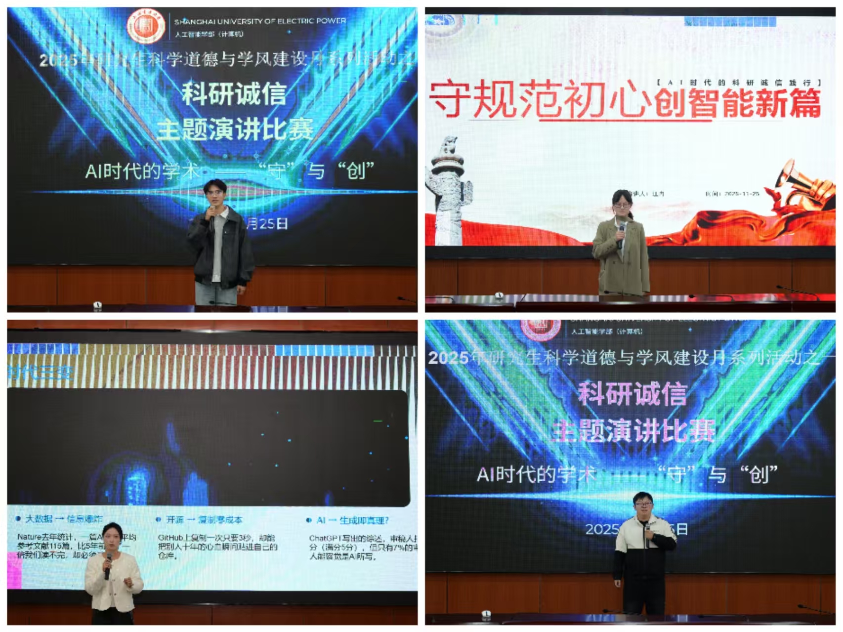 11月20日,太阳集团tyc151cc在学术楼报告厅103会议室举办“AI时代的学术‘守’与‘创’”科研诚信主题演讲比赛。本次比赛强化研究生对科研诚信的理解,引导学生在人工智能时代坚守学术道德底线。十位参赛选手依次登台,围绕“AI时代的学术‘守’与‘创’”学风建设与学术诚信主题展开演讲。选手们或引经据典阐释诚信价值,或剖析真实案例警示学术不端后果,或分享内心感悟表达坚守科研初心。他们从不同角度阐述了在人工智能技术快速发展的背景下坚守科研诚信的重要性。选手们的精彩表现引发全场同学的共鸣,现场掌声不断。此次演讲比赛通过富有感染力的形式,为为期一个月的学风建设月画上圆满句号,进一步强化了研究生的学术规范意识,为营造风清气正的学术环境提供了有力支撑。
