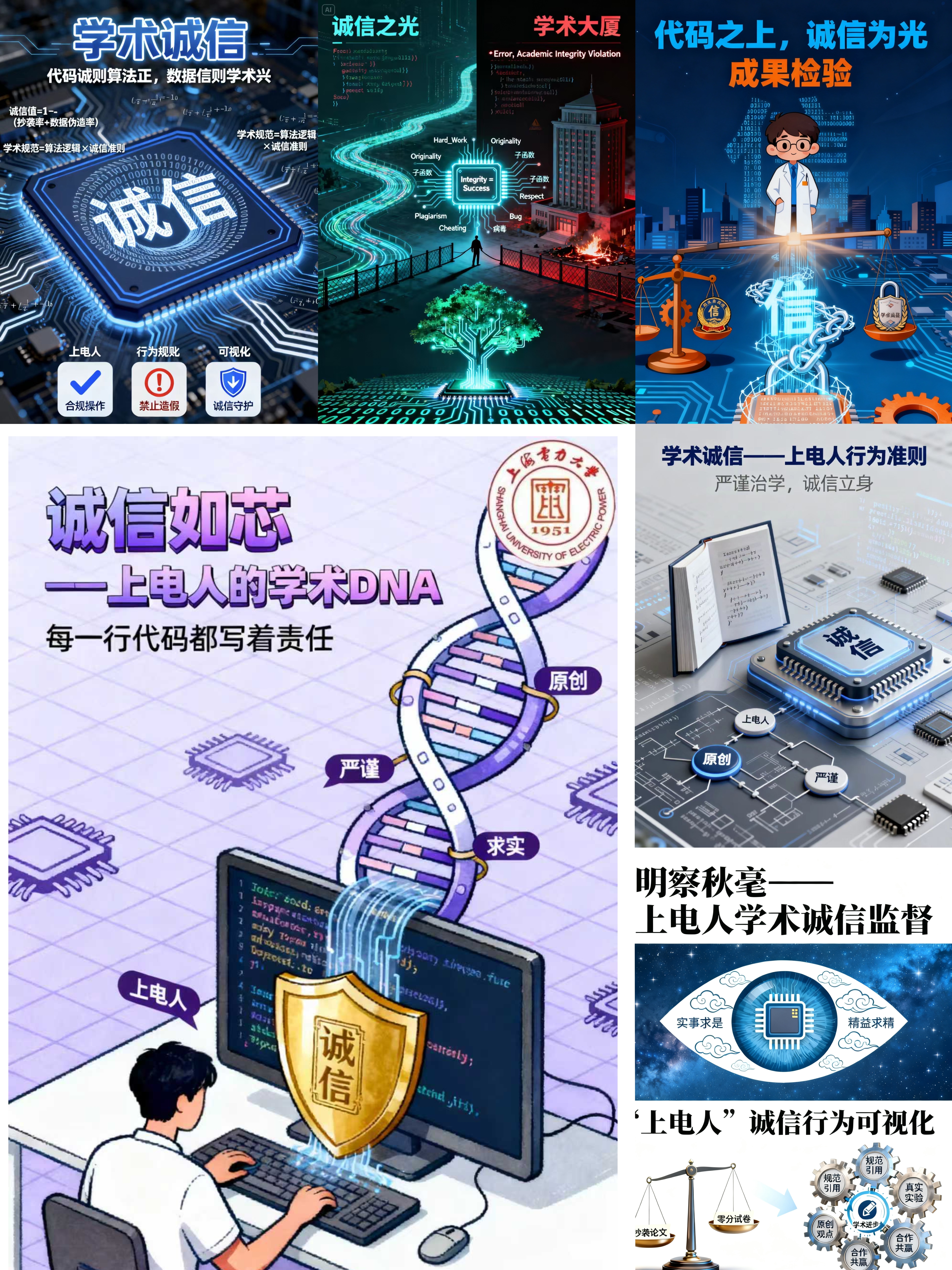 10-11月,太阳集团tyc151cc举办了“代码之上·诚信为光”--学术诚信主题海报设计大赛。活动通过视觉艺术形式,将抽象的学术诚信理念与计算机学科特色相融合,引导学生深入思考并践行科研规范。大赛共收到20多幅高质量参赛作品,作品紧扣学术诚信主题,结合专业特点巧妙融入代码、算法、芯片等计算机元素。经过学生投票和教师投票,最终评选出一等奖作品一幅,二等奖作品两幅,三等级作品三幅。其中,谭伟彪同学的作品《诚信如芯——上电人的学术DNA》获得一等奖,活动通过视觉化表达提升了学术诚信教育的吸引力与感染力,让诚信理念在艺术创作中更加深入人心,有效增强了研究生群体的学术规范意识。