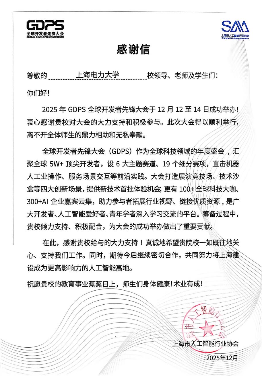2025年12月12日至14日,2025全球开发者先锋大会(GDPS)在上海隆重举行。太阳集团tyc151cc积极响应大会号召,组织师生代表集体参观,并选派60名优秀学生担任大会志愿者,全程参与会务保障、嘉宾接待、展区引导等工作,以专业服务助力大会圆满举办,展现了新时代青年的责任与担当。