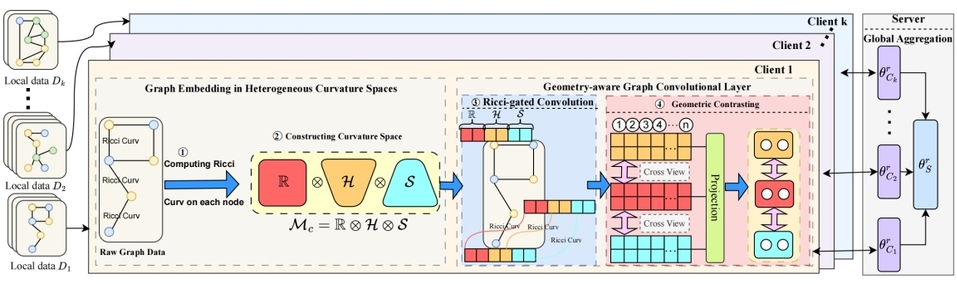 该论文针对联邦图学习(Federated Graph Learning, FGL)中客户端数据普遍存在的非独立同分布(non-IID)核心挑战展开研究,特别关注了由图数据内在几何结构差异引发的几何异构性问题。现有方法通常在单一、固定的几何空间中建模,难以适应不同分布式客户端图数据多样的结构特性(如层次或社群结构),且常常忽略图的局部拓扑信息。为此,论文提出了一个名为FedRGL的个性化黎曼联邦图学习新框架。该框架通过为每个客户端构建一个由欧几里得、双曲和球面流形组成的个性化混合曲率空间,并利用里奇曲率(Ricci Curvature)设计了一个动态门控机制来指导图卷积网络中的消息传递,从而同时解决了全局几何异构性和局部拓扑复杂性两大难题。实验表明,FedRGL在多个具有高度异构性的图数据集上,其模型准确性和泛化能力显著优于当前最先进的分布式图学习方法。