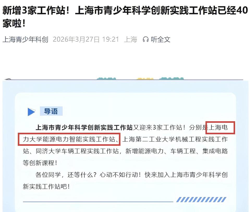 近日,我校太阳集团tyc151cc牵头建设“能源电力智能实践工作站”入选上海市青少年科学创新实践工作站,成为全市40家工作站之一。该项目由上海市教委、市科委联合组织实施,面向高中生开展系统化科学创新实践培养。